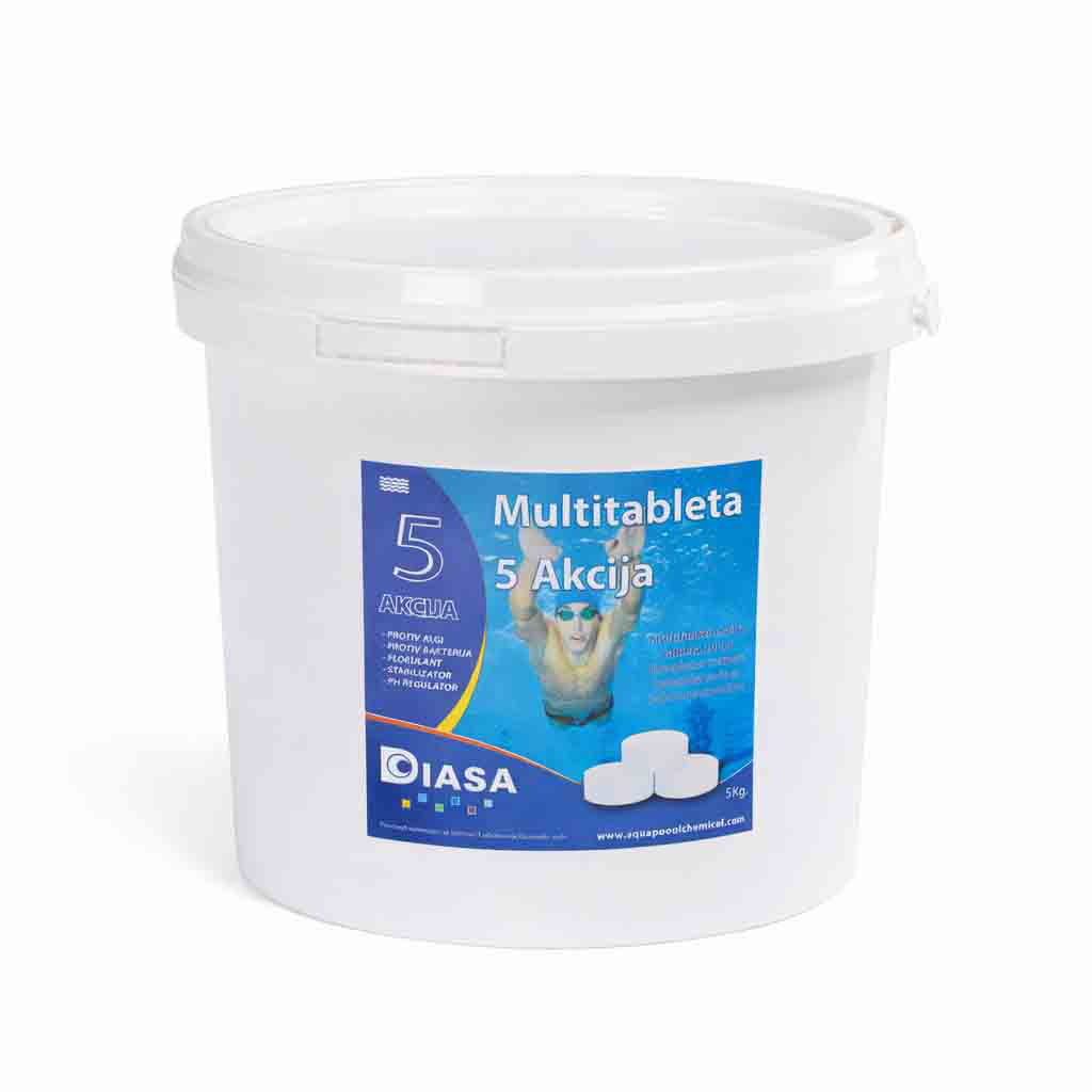 Multi Action tablete Diasa 5u1 5kg predstavljaju praktično i ekonomično rešenje za dugotrajno održavanje čiste, bistre i higijenski ispravne bazenske vode. Zahvaljujući 5u1 formuli, svaka tableta kombinuje dezinfekciju, algicidno delovanje, flokulaciju, stabilizaciju i antibakterijsku zaštitu.